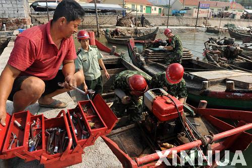 9月5日,船艇修理廠官兵來到青島市膠南東山村漁碼頭為漁民維修漁船。新華社記者 李紫恒 攝