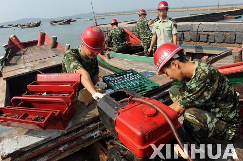 9月5日,船艇修理廠官兵在青島市膠南東山村漁碼頭為漁民維修漁船。新華社記者 李紫恒 攝
