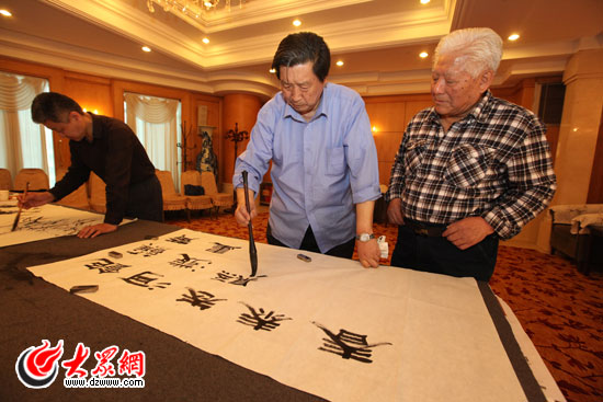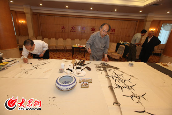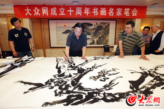 山東著名書畫家為慶祝大眾網成立十周年現場揮毫潑墨。