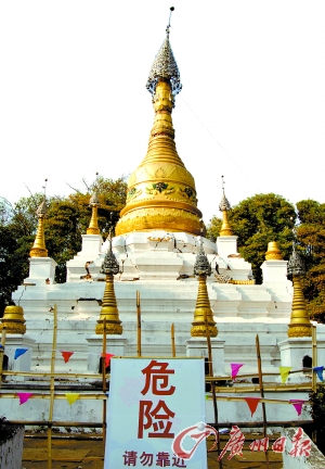 云南盈江縣全國重點文物保護單位允燕塔本是一座金碧輝煌的傣式佛塔,是盈江的標志性建筑,在地震中受到嚴重損壞。昨日記者在現場看到,允燕塔目前已傷痕累累,成了一座不允許游客靠近的“危塔”。