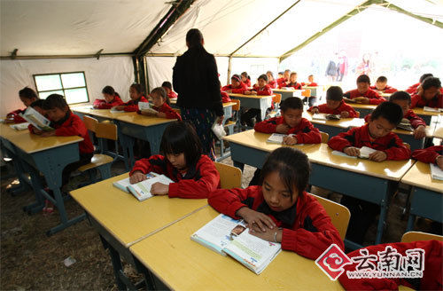 記者:崗勐小學是震后建成的第一所帳篷小學。到今天上午,盈江縣已有143所小學、15所初中、部門高三學生已經復課。學校復課率達到2/3。到3月21日,學生將全部復課。