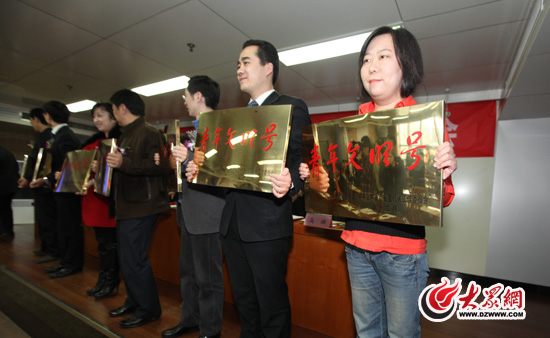 齊魯晚報青年記者喬顯佳、董釗、魯超國、劉紅杰、劉爽等領取榮譽證書。