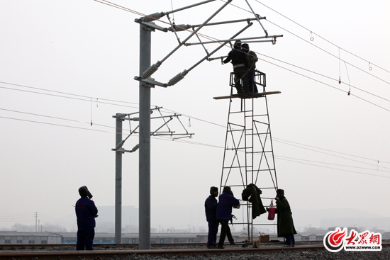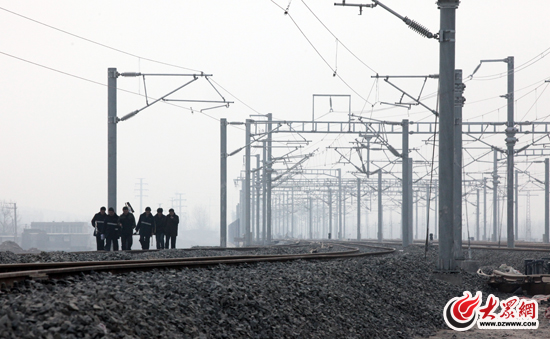 2月8日接近中午12點,初春暖陽下寒風依舊料峭。一群頭戴皮帽、身穿藍色工作服的鐵路工人冒寒在京滬高鐵西客站鐵道工地上干得起勁兒。此時,胡克俊副段長與姚志剛隊長正在道軌上向中鐵電氣化局項目經理匯報工程進展情況 。因為他們要提前完成工程,保障京滬高鐵濟南段西客站本月18日前能夠送電。
