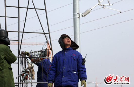 王志強與姚志剛同是河南老鄉,兩人今年都42歲,在王志強眼里,隊長姚志剛是個只知道悶頭干活的漢子。記者采訪期間,姚志剛與幾個小弟兄們一直推著5米多高的云梯忙著吊弦工作。等到中午工歇吃飯的時間了,他才抽出時間與記者搭話。我這才發現,他那張被耷下的皮冒下遮蓋的臉是那么黝黑。交談間,他不善言辭,而他說出的像“隔離開關 、絕緣器、上網線”、“架線、吊弦、挽臂”等一串串專業名詞卻讓記者聽得云里霧里的。他說,根據上級安排,他們 一行40多人于去年12月份從哈大高鐵線上下來之后,就趕到了京滬高鐵線濟南西客站段,主要任務是負責三個股道的長 達三公里的鐵路電氣安裝調試工作。春節期間,他們的隊伍只剩下了二三十個人仍堅守一線。