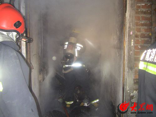剛過晚上八點,又一個火警:南辛莊一民宅有火情!“鈴……”消防官兵對這種聲音似乎已有本能反應。厚重的戰斗服對于他們速度的阻礙似乎并不存在,記者緊跟其后上了載重6噸的水罐車(一米多高的車門并不容易攀爬)。消防車沿經七路一路向西,四分鐘左右到達現場。著火建筑為一幢民居平房,此時,濃煙夾雜火苗借著風勢從該平房東側一間屋子噴出。經詢問得知,屋內并無人員被困。經過消防官兵十幾分鐘的撲救,大火被撲滅。