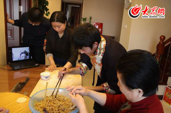 “哈哈,姐姐,今天過年呢,我這是在我濟南的弟弟桑漫坤家,他們對我可好了。我帶你看看,我們正在包水餃呢。”