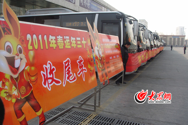 在長途汽車總站南區(qū),下午發(fā)出的收尾車一字排開,車頭上也貼上了象征吉祥的福字。