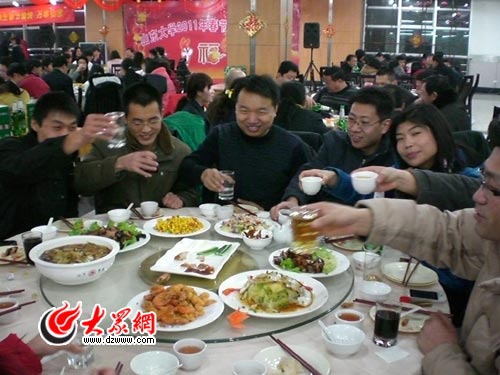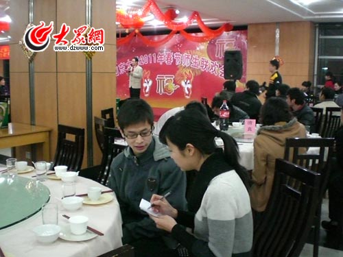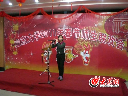2月1日是農(nóng)歷的臘月二十九,夜色未到,濟(jì)南的上空已經(jīng)是鞭炮聲聲,年味兒越來(lái)越濃了。17:30,記者來(lái)到山東大學(xué)中心校區(qū),此時(shí)的綜合服務(wù)樓三層大廳里歌聲、笑聲、歡呼聲響成一片,山東大學(xué)2011年春節(jié)師生聯(lián)歡會(huì)正在這里舉行,近200名留守學(xué)生與老師們歡聚一堂,共賀兔年新春。