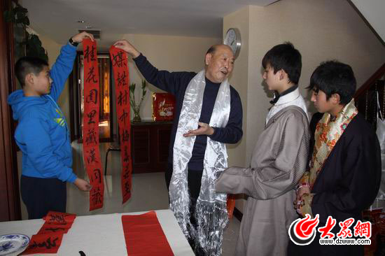 客廳的桌子上早就擺好了紅紙和筆硯,“孩子們過來,這是我剛剛寫好的對(duì)聯(lián)。”桑漫坤的爺爺桑炳明是中國(guó)楹聯(lián)學(xué)會(huì)會(huì)員、楹聯(lián)專家,他給孩子們說起春聯(lián)興致盎然,“咱們對(duì)聯(lián)啊,分上聯(lián)和下聯(lián),我寫的上聯(lián)是媒體村中梅春并至,下聯(lián)是桂花園內(nèi)藏漢同歡,橫批藏漢新春。走,咱們一塊把春聯(lián)貼上吧。”