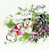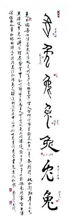 山東大學教授俞黎華先生用甲骨、籀文、小篆、西漢簡書、東漢刻石、草書、楷書七種字體書兔,還撰寫了一首饒有趣味的詩:兔本瑞獸,性情善良,形象嬌美,代言月亮。故里寒宮,人皆仰望,吃草獻裘,如牛似羊,奔騰躍躍,粉絲劉翔。身手不凡,兼擅岐黃。兔竹濟世,理應贊賞。中秋時節,尊兔為王。人無完人,兔亦同樣。優點N多,囧事也彰。與龜競賽,盲目謙讓。偶爾犯暈,和株相撞。茲今往后,美德弘揚。兔飛精進,缺點相匡。辛卯伊始,七兔呈祥。兔毫書兔,惠風和暢。