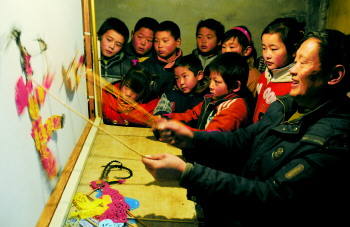 2月7日,山亭區(qū)宋莊村皮影藝人邢如雨(右一)向孩子們傳授皮影戲的表演技巧。