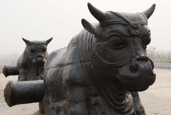 黃河大鐵牛位于山西省永濟市蒲州城西的黃河?xùn)|岸,是當(dāng)時蒲津浮橋的鎮(zhèn)橋之寶。鐵牛是用作拴鐵索用,鐵索連舟便成了浮橋。四尊鐵牛氣勢磅礴,威武有力,每尊鐵牛旁都有一個牽牛鐵人,造型精美,栩栩如生,分別代表四個不同的民族。黃河鐵牛對研究唐代政治、經(jīng)濟、軍事、文化、橋梁架設(shè)、冶煉鑄造以及黃河變遷等方面提供了可靠的科學(xué)依據(jù)牞有很大的歷史考古價值牞并稱為國寶。