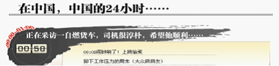 19日當天下午,朱總再次召集大家開會,各部門匯總情況,研究專題的表現形式。當時我簡單描述了自己的構想,提出做兩個頁面,一個頁面是寫著“中國一日”的盒子里跳出“讀者各式各樣的一天”;另一個頁面按時間順序排列,結構按24小時分成24個部分,每一部分用“讀者的話”當標題,這么安排主要是考慮到網友上傳的作品太多,尤其是手機報讀者的短信直播短又多,不好表現,按時間分類就能把雜亂的作品主題化。
