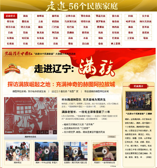 “黨旗漫卷中國(guó)紅”專題是后方編輯團(tuán)隊(duì)集體智慧的結(jié)晶。從前期策劃到最后出爐,頻道部多次開(kāi)會(huì)商討方案,幾易其稿,整個(gè)專題在標(biāo)題設(shè)置、內(nèi)容編排、動(dòng)畫(huà)制作、圖片放置、媒體互動(dòng)等方面都進(jìn)行了大膽創(chuàng)新。通過(guò)文字、圖片、視頻、flash動(dòng)畫(huà)、音頻等多種形式全方位的呈現(xiàn)這道“民族大餐”。后方編輯團(tuán)隊(duì)歷時(shí)半年時(shí)間參與“黨旗漫卷中國(guó)紅”專題報(bào)道,通過(guò)58個(gè)二級(jí)頁(yè)面,完成一部56個(gè)民族的“百科全書(shū)”。