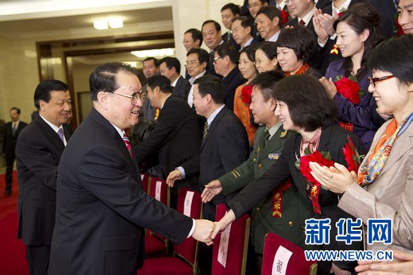 11月4日,第二十一屆中國新聞獎、全國優秀新聞工作者頒獎報告會在北京舉行。中共中央政治局常委李長春親切接見獲獎代表。 新華社記者黃敬文 攝