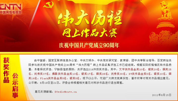 由中宣部、國家互聯網信息辦公室、中央文明辦、中央黨史研究室、教育部、團中央等聯合指導,百家網站共同參與的慶祝中國共產黨90周年“偉大歷程”網上作品征集評選已結束,共評出214件獲獎作品。其中,大眾網選送的視頻作品《黨旗漫卷中國紅》獲DV類作品金獎,網友胡爽的《聆聽》、網友王恩懷的《中國紅》獲攝影類作品銀獎。大眾網選送的視頻作品《黨旗漫卷中國紅》獲DV類作品金獎,網友胡爽的《聆聽》、網友王恩懷的《中國紅》獲攝影類作品銀獎。