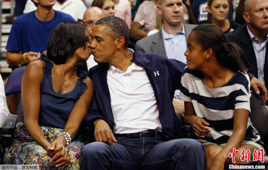 當地時間2012年7月16日,美國華盛頓,美國總統奧巴馬攜妻子(左)米歇爾和兒女瑪利亞(右)觀看了美國男籃和巴西隊的表演賽。圖為奧巴馬與妻子米歇爾接吻。