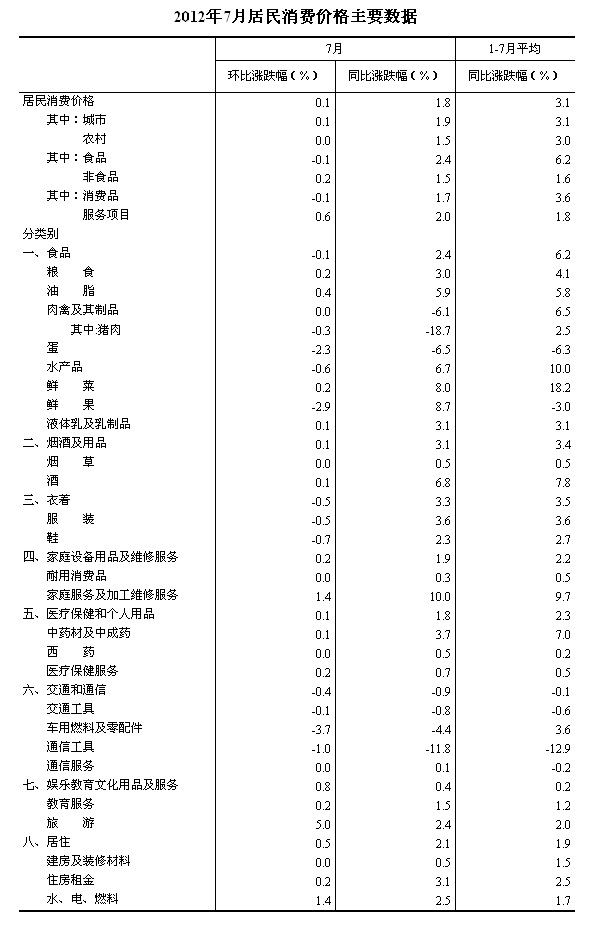2012年7月份,全國居民消費價格總水平同比上漲1.8%。其中,城市上漲1.9%,農村上漲1.5%;食品價格上漲2.4%,非食品價格上漲1.5%;消費品價格上漲1.7%,服務項目價格上漲2.0%。1-7月平均,全國居民消費價格總水平比去年同期上漲3.1%。