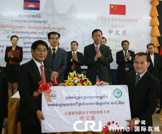 國際在線消息(記者郭翔青、鄧倩)柬埔寨王家研究院孔子學(xué)院與柬埔寨亞歐大學(xué)合作成立的中文系揭牌儀式10日在位于金邊的亞歐大學(xué)舉行。