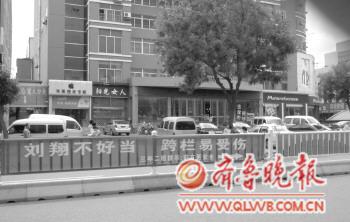 寫有“劉翔不好當,跨欄易受傷”宣傳語的條幅掛于海陽市海陽路的一處護欄上。圖片由市民邢志新提供。