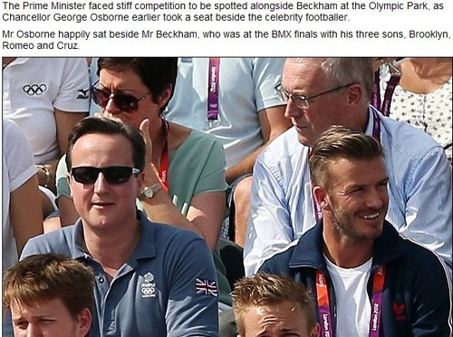 值得一提的是,包括英國(guó)首相卡梅倫(David Cameron)和財(cái)政大臣喬治?奧斯本在內(nèi)的一些政界名人身影經(jīng)常出現(xiàn)在貝克漢姆身邊的座位上,有“搶鏡頭”之嫌。