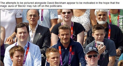 [提要] 據(jù)英國(guó)《每日郵報(bào)》8月10日?qǐng)?bào)道,2012年倫敦奧運(yùn)會(huì)期間,英國(guó)足球明星貝克漢姆(David Beckham)成為奧運(yùn)觀眾席上最引人關(guān)注的名人之一。值得一提的是,包括英國(guó)首相卡梅倫(David Cameron)和財(cái)政大臣喬治?奧斯本在內(nèi)的一些政界名人身影經(jīng)常出現(xiàn)在貝克漢姆身邊的座位上,有“搶鏡頭”之嫌。