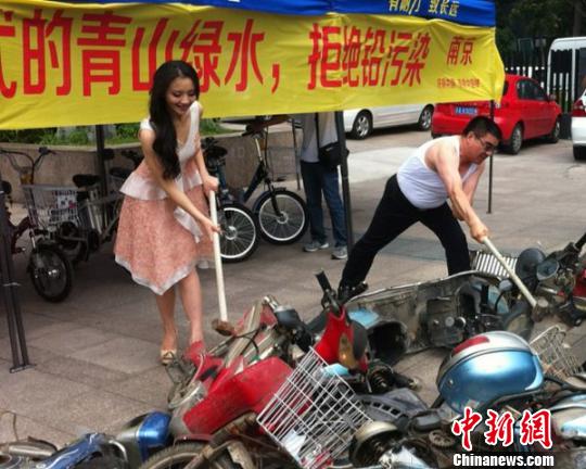 陳光標與“槿汐”舉錘砸碎鉛酸電動車。盛捷攝