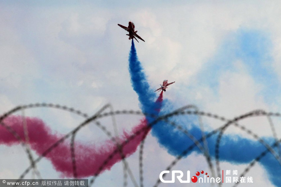 國際在線消息:當(dāng)?shù)貢r間2012年8月12日,在俄羅斯茹科夫斯基,俄羅斯Su-27、Su-25和Mig-29戰(zhàn)機(jī)在空中表演,擺成數(shù)字100的樣子。意大利空軍飛行表演隊也進(jìn)行了精彩表演。俄羅斯慶祝空軍成立100周年。