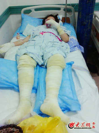 8月16日17時(shí),記者在位于青島市南區(qū)的一家燒傷醫(yī)院的一樓病房里,見(jiàn)到了其中4位受傷較為嚴(yán)重的游客。