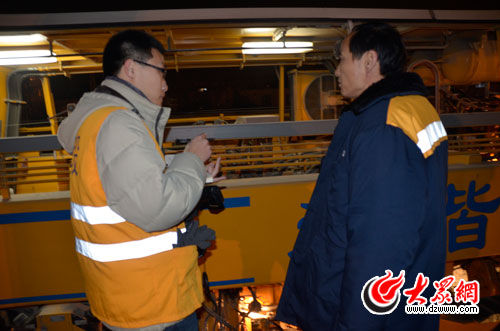 14日零點(diǎn)40分,室外溫度已接近零下6度,維修機(jī)車隨著道軌的變換再度轉(zhuǎn)場(chǎng),這群在深夜里默默工作又鮮為人知的工人師傅們又開(kāi)始膠濟(jì)鐵路客運(yùn)線上行線的搶修工作,機(jī)器再度轟鳴起來(lái),燈火依舊明亮……