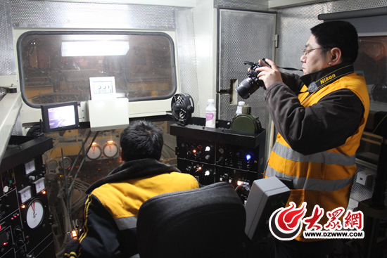 記者登上出發(fā)前的機(jī)車車頭,其他的師傅們正在進(jìn)行出發(fā)前的檢查。(大眾網(wǎng)記者 馬鑫攝)