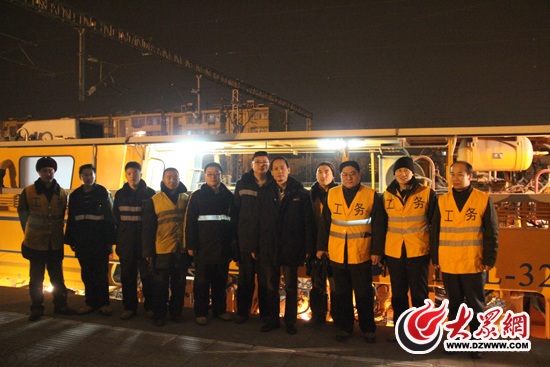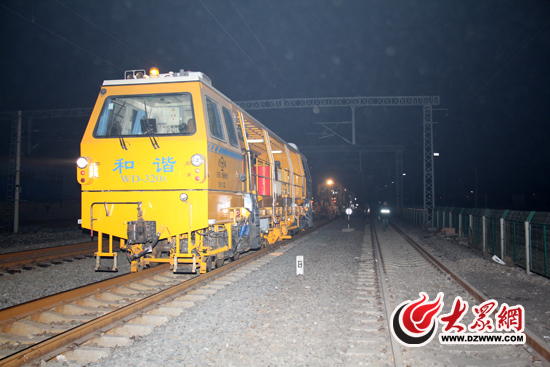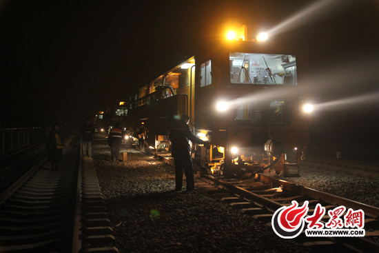 [提要] 1月13日晚上8點(diǎn)28分,淄博市臨淄火車站前,漆黑、安靜。大眾網(wǎng)記者跟隨濟(jì)南鐵路局工務(wù)機(jī)械段的20多名維修工走上月臺(tái)。此時(shí),鐵軌上,一組50多米長(zhǎng)的維修機(jī)車正靜臥在膠濟(jì)鐵路客運(yùn)專線上,等待我們的到來(lái)。