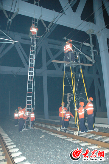 [提要] 2012年1月19日凌晨4點(diǎn),京滬高鐵濟(jì)南西站處于一片寧靜當(dāng)中,幾名身穿橙色熒光服的工人在燈光下格外顯眼,在衣服背面,大大的“供電”二字表明了他們的身份。自京滬高鐵正式開通運(yùn)營以來,為保證京滬高鐵動(dòng)車的運(yùn)行安全,在第一趟客運(yùn)動(dòng)車運(yùn)行前,濟(jì)南鐵路局會(huì)在每天早晨5點(diǎn)至6點(diǎn)在多個(gè)線路加開 “動(dòng)車組確認(rèn)車”。作為“探路先鋒”,登乘此車的工作人員的工作便是檢測檢查線路、信號(hào)和牽引供電設(shè)備,認(rèn)真察看前方接觸網(wǎng)有無異物及安全隱患的運(yùn)行情況,保證旅客列車的運(yùn)行安全。