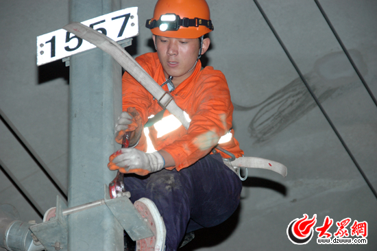 趁著開“天窗”的時(shí)間,濟(jì)南供電段的接觸網(wǎng)工檢測隧道內(nèi)的線路狀況。