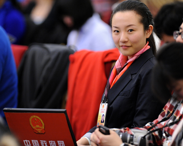 2012年3月14日11時(shí),溫家寶總理在人民大會(huì)堂三樓金色大廳與中外記者見(jiàn)面并答問(wèn)。圖為新華網(wǎng)、中國(guó)政府網(wǎng)記者在現(xiàn)場(chǎng)。陳競(jìng)超 攝