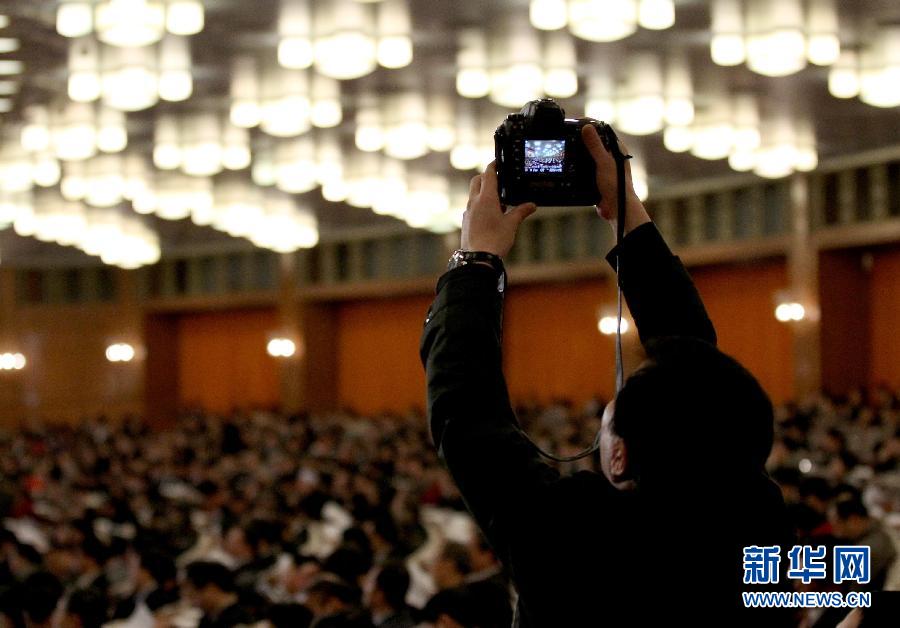 3月11日,全國政協(xié)十一屆五次會議在北京人民大會堂舉行第四次全體會議。這是一名記者在會場采訪。 新華社記者 蘭紅光 攝