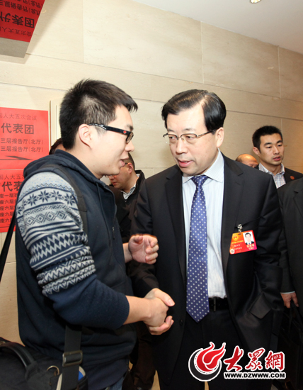 全國人大代表、煙臺市委書記、市人大常委會主任張江汀(右)接受大眾網(wǎng)記者采訪。