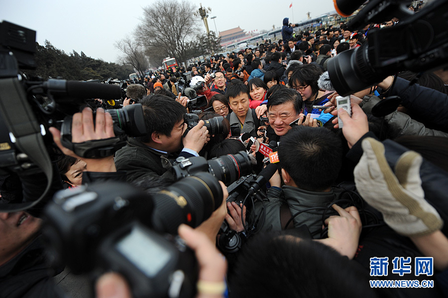 2012年3月3日15時(shí),全國(guó)政協(xié)十一屆五次會(huì)議在人民大會(huì)堂舉行開(kāi)幕會(huì)。圖為全國(guó)政協(xié)委員陳竺遭遇媒體圍堵采訪(fǎng)。新華網(wǎng) 陳競(jìng)超 攝