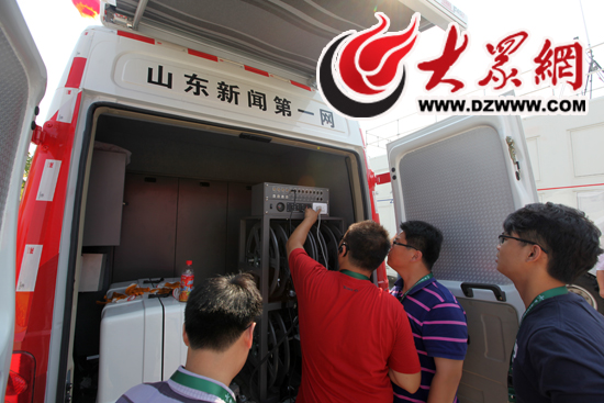 大眾網工作人員正在調試衛星直播車,明日將對開幕式進行全程直播。