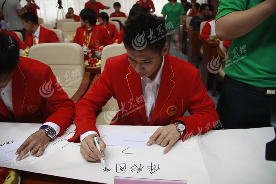 奧運(yùn)健兒在留言簿上簽名留言。
