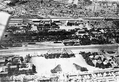1928年,濟(jì)南兩座老火車站的“合影”。照片為由南向北航拍,上半部分清晰可見(jiàn)津浦鐵路濟(jì)南火車站(1992年7月拆除)及其周邊,下半部分為膠濟(jì)鐵路濟(jì)南火車站及其周邊。 (選自山東畫(huà)報(bào)出版社2011年3月出版第75輯《老照片》 馮寶忠供圖)