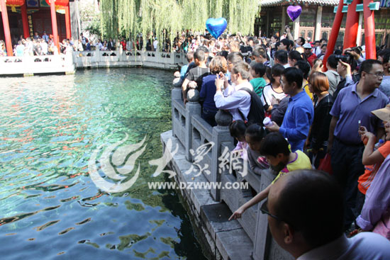 趵突泉被熱情游客包圍,游客們紛紛舉起相機拍照留念。