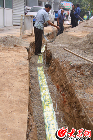 4日下午,在濟(jì)南市舜玉北區(qū)93號(hào)樓前,在濟(jì)南水務(wù)集團(tuán)供水管網(wǎng)工程師賈振忠指揮下,一節(jié)節(jié)直徑為110mm的PE塑料管經(jīng)過(guò)熱熔機(jī)加熱密封聯(lián)接后,變成了一條百余米的管道,被工人們放到早已挖好的溝槽中。不遠(yuǎn)處,挖掘機(jī)在小區(qū)內(nèi)的一條主干道旁開(kāi)挖新的溝槽,為幾天后鋪設(shè)主管網(wǎng)做準(zhǔn)備。