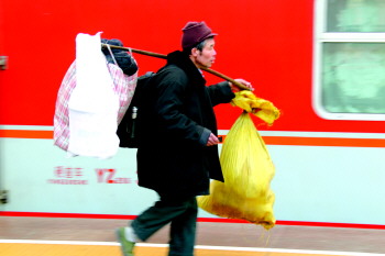 2月2日,青島火車站,一位老者肩挑行李、手捏車票,準備踏上從青島至鄭州的返鄉列車。