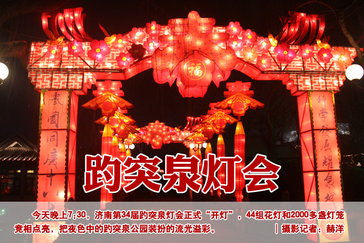 大眾網濟南2月6日訊記者 赫洋)今天晚上7:30,濟南第34屆趵突泉燈會正式“開燈”,44組花燈和2000多盞燈籠競相點亮,把夜色中的趵突泉公園裝扮的流光溢彩。