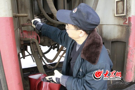 今天下午,當(dāng)記者來到庫(kù)檢車間的時(shí)候,一排一排的火車車廂正排放在鐵軌上,穿著制服的工作人員在車上忙上忙下。這時(shí),亓傳赟正在一輛列車上工作,他通過對(duì)講機(jī)知道記者到來后,馬上從火車上跳下來,雙手在衣服上使勁抹了抹,才握住記者的手表示歡迎。