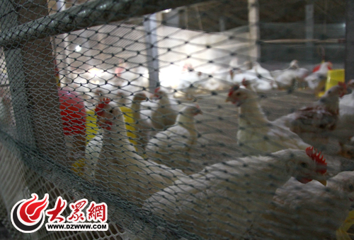 在李富來的帶領(lǐng)下記者鉆進(jìn)了他家的雞棚,棚里的燈光很暗,雞欄里的雞如今都已經(jīng)長(zhǎng)成,雖然棚里的通風(fēng)措施做得不錯(cuò),但是濃烈的雞糞味還是熏得人直頭疼,可能是因?yàn)榈搅宋故车臅r(shí)間,看到有人進(jìn)來棚里的雞就一起咕咕的叫了起來。