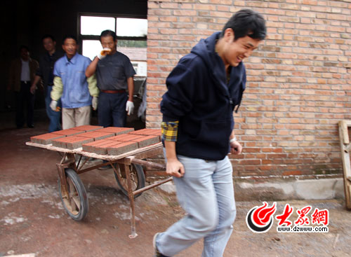 整個過程雖然看似簡單,但卻需要大量的經驗和高度的耐心。工人師傅們不僅要指導記者正確的姿勢和手法,還要時刻提醒記者注意安全。記者目送著經過辛苦勞動的底料和石粉一并被送進壓制機,一轉眼,12塊紅磚就新鮮出爐了。