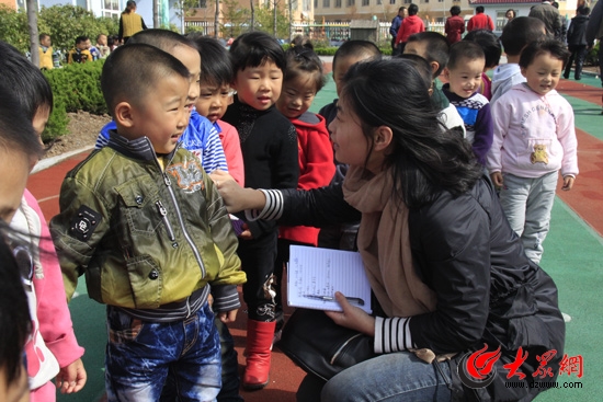 大眾網(wǎng)走基層問民生采訪小組記者劉欣走進棘洪灘下崖幼兒園進行采訪(曹亮 攝)