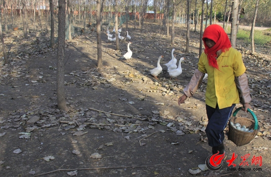 孫立強跟記者介紹說,像他這樣的林下養殖戶在中華埠目前僅有六七戶,他家是村里第一戶開始林下養殖的,村里對林下養殖給予了大力的支持,正在大力推廣。現在孫立強家承包的八十畝林地里養著三千多只雞,百十只美洲雁,近五十只鵝,二十來只鴨,“在林子里放養,喂的都是玉米和豆餅,咱這是純正的綠色生態養殖,雞蛋都是生態雞蛋”,孫立強自豪地說。當記者問起孫立強現在的收入和付出的成本時,他高興地跟記者說起了如今的行情:“土雞蛋現在能賣到十五塊錢一斤,家里養著三千只雞,零散養的美洲雁、鴨子、鵝這些數量不多但是行情都很好,一年能掙到十四五萬,但總共交給村里的土地承包費才不到一萬塊錢。”“那雞蛋的銷量有保障嗎?”聽到記者這個問題,孫立強和旁邊陪同來采訪的村干部都笑了起來,“都搶著來買,純天然的土雞蛋銷路根本不愁,供不應求,供不應求!”聽到這話,記者也跟著樂了。在跟孫立強聊著的時候,孫立強的妻子徐大姐正要提著籃子去林子里撿雞蛋,記者看到便上前與她聊了起來。徐大姐說,母雞下蛋一天最集中的是兩次,上午八點半左右和下午四點半左右,另外上午十點半和下午十二點半她還會再去收一次,“一天下來您要圍著林子走四趟?”記者有些吃驚,“是。 边呎f著,徐大姐笑著走到近處的雞窩彎下腰就開始拾雞蛋。